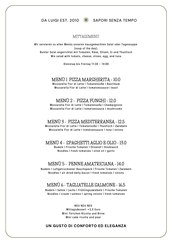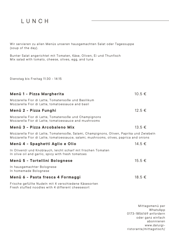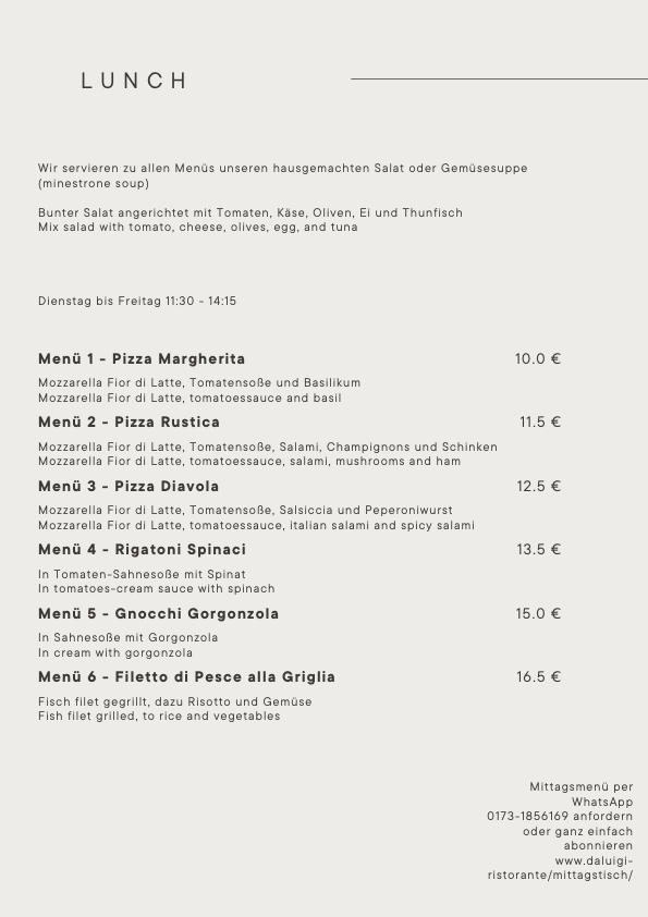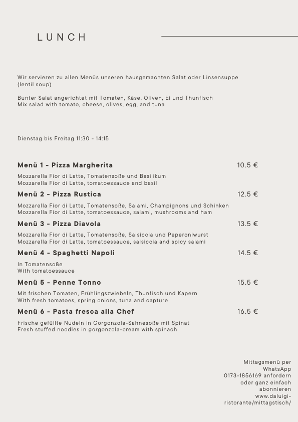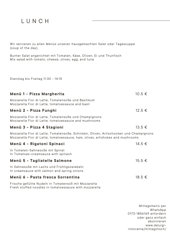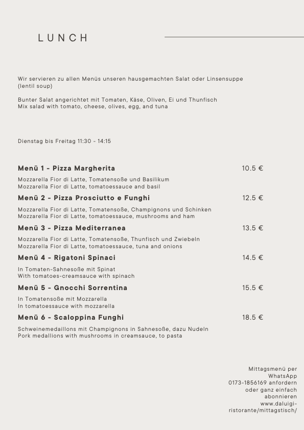 Mittagstisch Mittagstisch-Karte per E-Mail erhalten Thank you for subscribing. Something went wrong. Ich akzeptiere die Datenschutzerklärung Tragen Sie sich in den Verteiler ein und Sie bekommen unsere Mittagsmenü-Karte jede Woche bequem per E-Mail zugeschickt – selbstverständlich kostenlos. Die Mittagstisch-Mail wird wöchentlich verschickt. Sie können sich in jeder E-Mail aus dem Verteiler austragen. Zur Datenschutzerklärung